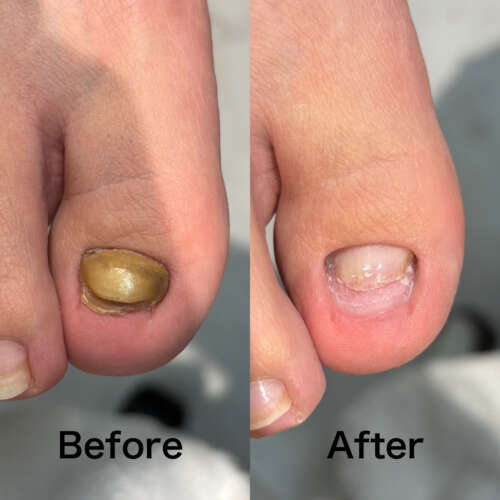 爪トラブルリカバリーケア初回のお爪の変化です。このようなお爪の方はだいたい残る爪は短くなってしまうことが多いため巻き爪矯正を行いながらケアをしていく場合もございます。