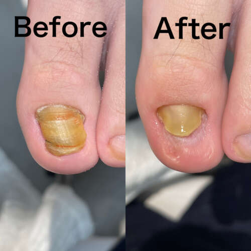 爪甲鉤彎症リセットケア初回のお爪の変化です。余分なお爪はカットして厚みは全て削って綺麗なお爪が伸びてきやすい状態にしました。