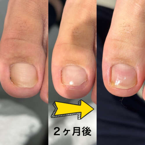 そこで今回は、まず浮いている爪を必要な範囲でカットして整え、お客様には毎日テーピングを行っていただきました。テーピングは、爪が伸びてくる方向をサポートし、爪が生えてきやすい環境を整えるためにとても重要です。お客様がしっかり継続してくださったことで、2ヶ月後には爪の幅も広がり、きちんと伸びてきてくれました。