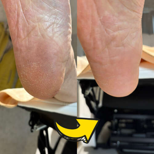 冬に気になるガサガサ踵もフットケアをすると一度でこんなに綺麗になります。硬くなった角質を取り除いた後に保湿をしていただくとさらに綺麗な状態が長持ちしますので毎日の保湿をおすすめしております。