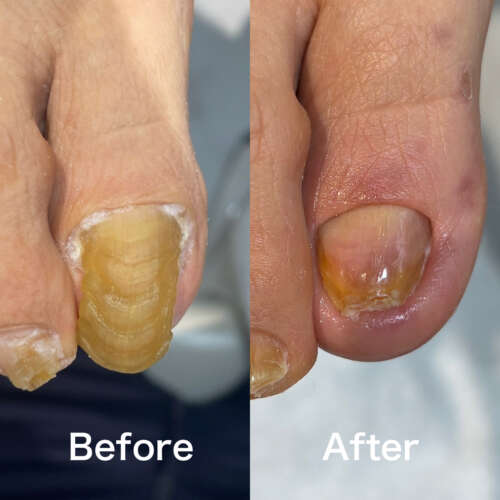 初回ご来店時は、爪がかなり分厚くなっており、見た目の変化だけでなく、靴に当たりやすかったり、ご自身でのケアが難しい状態でした。分厚い爪は日常の圧迫や乾燥などが重なることでさらに硬くなりやすく、放置すると爪白癬になりやすかったりと衛生的にも良くないです。