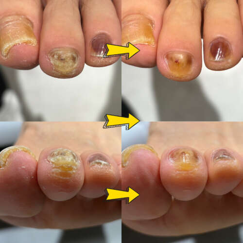 肥厚爪がお悩みで毎月ケアに来てくださっているお客様のビフォーアフターです。