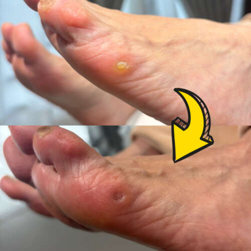 足裏に大きな魚の目ができており、歩くたびに痛みや違和感が出やすい状態でした。魚の目は、圧迫や摩擦が同じ場所に繰り返しかかることで芯ができ、放っておくと痛みが強くなったり、かばって歩くことで他の部位に負担が広がることもあります。