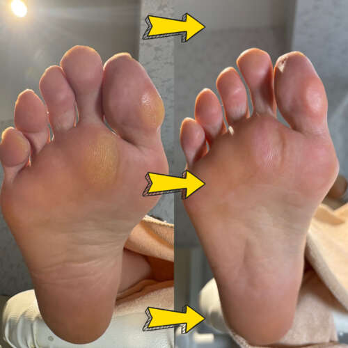 いつもご来店いただいているお客様のBeforeAfterのお写真です。ケア後は足裏がツルツルになり硬くなっていた角質は綺麗になくなりました。